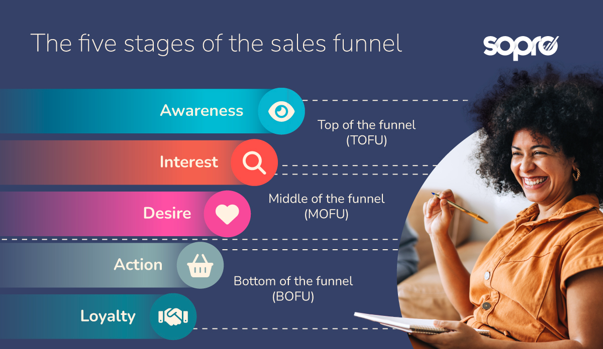Although models of the sales funnel vary, we’ll use a five-stage version that includes awareness, interest, desire, action, and loyalty.
